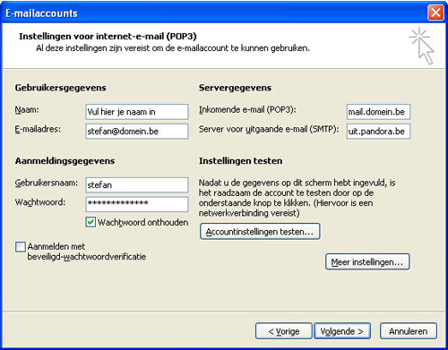 Als alle instellingen goed zijn, drukt u op "Volgende", U krijgt dan het scherm te zien dat het proces goed is doorlopen en dat alle instellingen voltooid zijn. Klik op ‘Voltooid’ om het scherm af te sluiten en om Windows Outlook 2003 te gebruiken voor het versturen en ontvangen van e-mail.