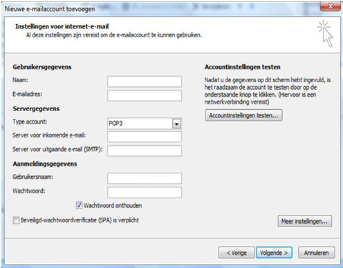 Indien u Outlook voor de eerste keer opstart dan zal deze wizard automatisch starten. Gebeurt dit niet, ga dan via de taakbalk naar "Extra", selecteer "Accounts", klik op "Toevoegen" en kies voor "E-mail". Wanneer u gebruikt maakt van outlook 2007 dient u deze procedure niet te volgen. Scroll naar beneden voor de procedure van een outlook 2007 client.
